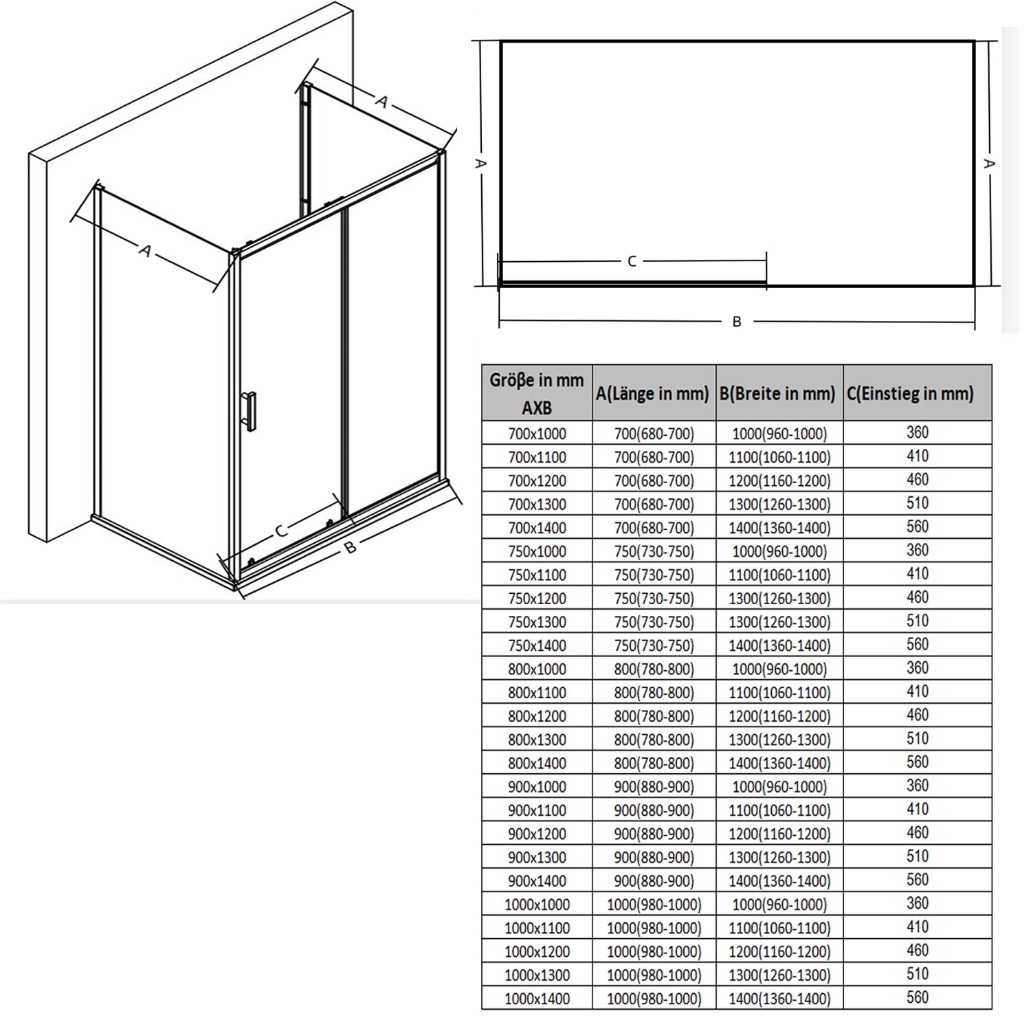 Freikombinierbar: Türgröße 100/110/120/130/140 cm + Seitenwand 70/75/80/90/100cm
